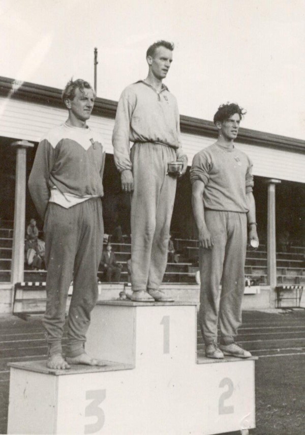 På biletet under ser ein Svein Frøyen (t.h.) under sigerseremonien under NM i 10 kamp i Trondheim, der han vann ein imponerande sølvmedalje.