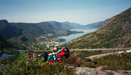 Bilete over Svelgen. Teke under førebuingane til aktivitetsveka for 9. klasse i 2004.